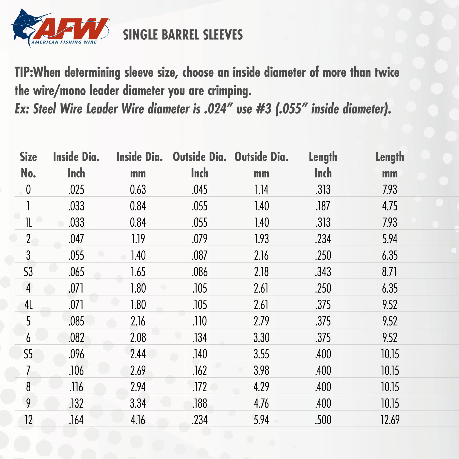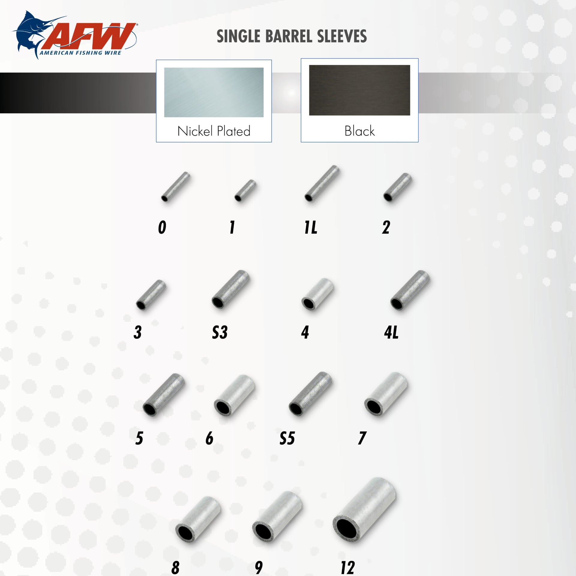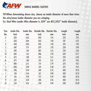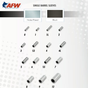 Sleeves are available in Nickel plated and Black oxidized. Double Barrel and Thin Wall Double Barrel Sleeves, available in Black finish, are excellent for use with big game mono leader material. Sleeves can be fitted to wire, monofilament, and other various lines. Burr-free nonabrasive finish combined with high strength and corrosion resistance makes AFW’s sleeves the preferred choice of professional leader, lure, and tackle manufacturers. Packaged in Retail Packs, 100/mini bulk, and 1,000 piece packages for resale, and 5,000 piece bulk packs for tackle manufacturers.