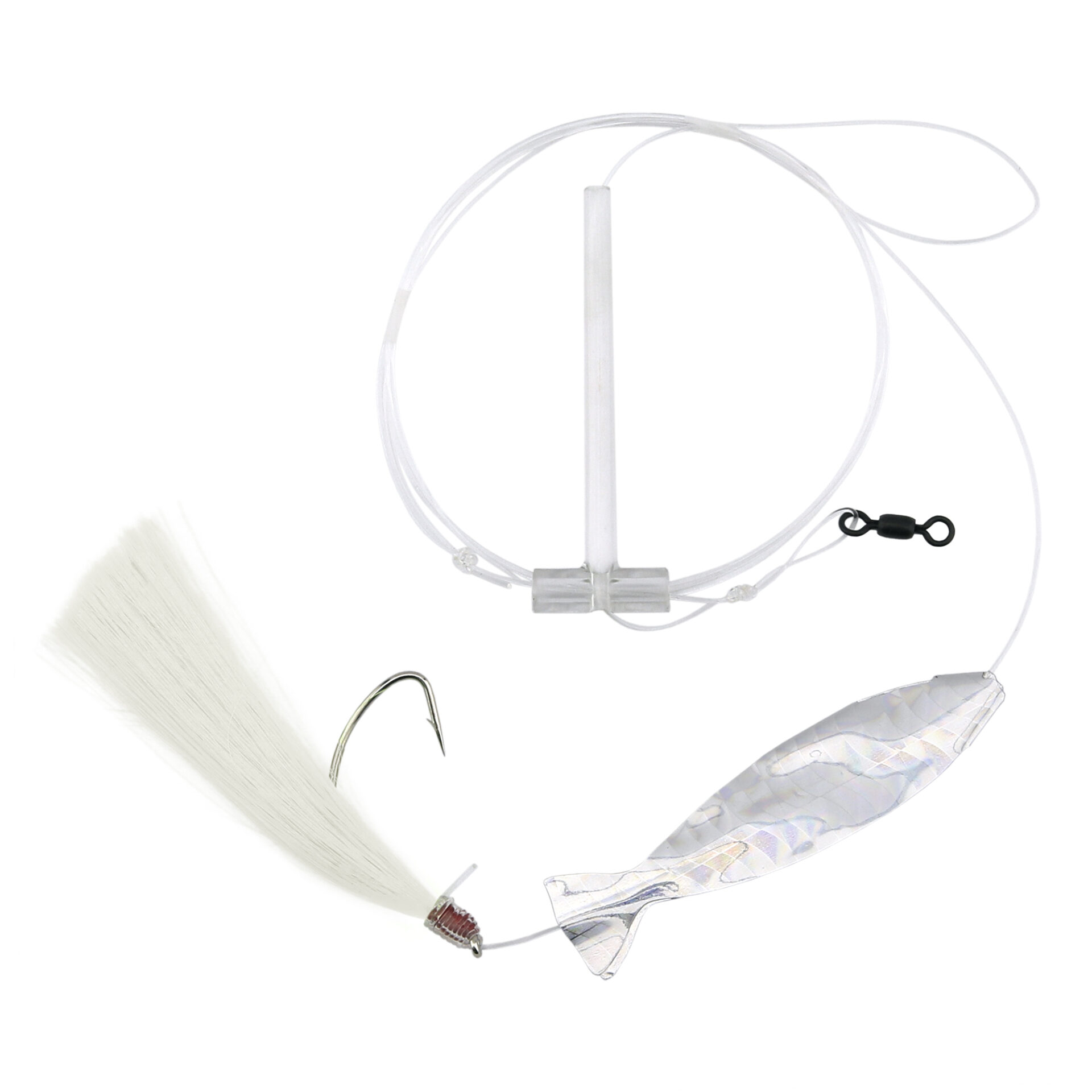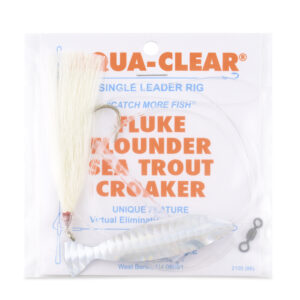 Aqua-Clear, Hair Teaser Rig, Flounder/Fluke/Sea Trout/Weakfish/Croaker, 3/0 Nickel Wide Gap Hook, AFW Swivel, 40 lb/18.1 kg GS Mono, T-Standoff, White Hair, Silver Holo MinnowAvailability: In stock