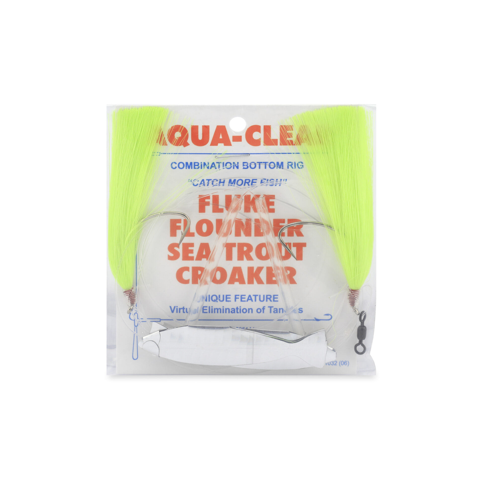 Aqua-Clear, Hi-Lo Hair Teaser Rig, Flounder/Fluke/SeaTrout/Croaker, 3/0 Nickel Wide Gap Hook, 40 lb / 18.1 kg GS Mono, T-Standoff, Chartreuse Hair, Silver Holographic MinnowAvailability: In stock