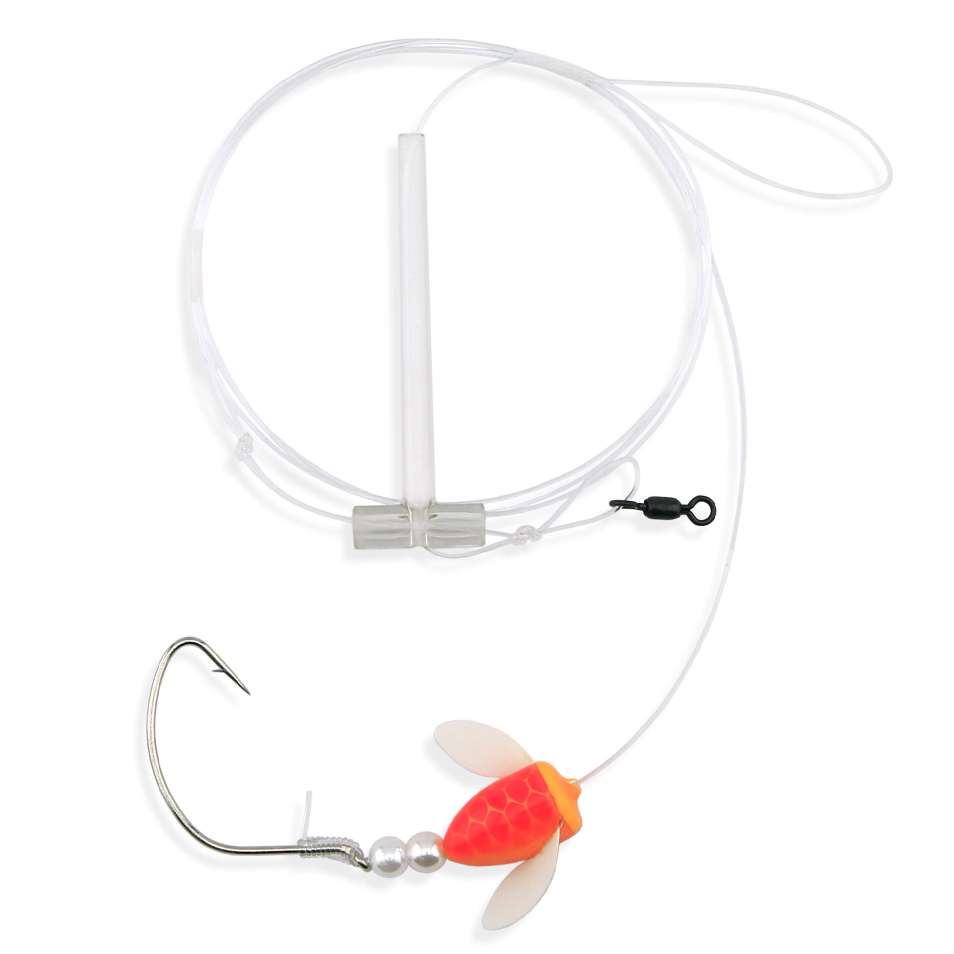 Aqua-Clear, Spin-N-Glow Rig, Flounder/Fluke/Sea Trout/Croaker, 3/0 Nickel Wide Gap Hook, AFW Swivel, 40 lb / 18.1 kg Grand Slam Mono, T-Standoff, Egg Orange, PearlsAqua-Clear, Spin-N-Glow Rig, Flounder/Fluke/Sea Trout/Croaker, 3/0 Nickel Wide Gap Hook, AFW Swivel, 40 lb / 18.1 kg Grand Slam Mono, T-Standoff, Egg Orange, Pearls