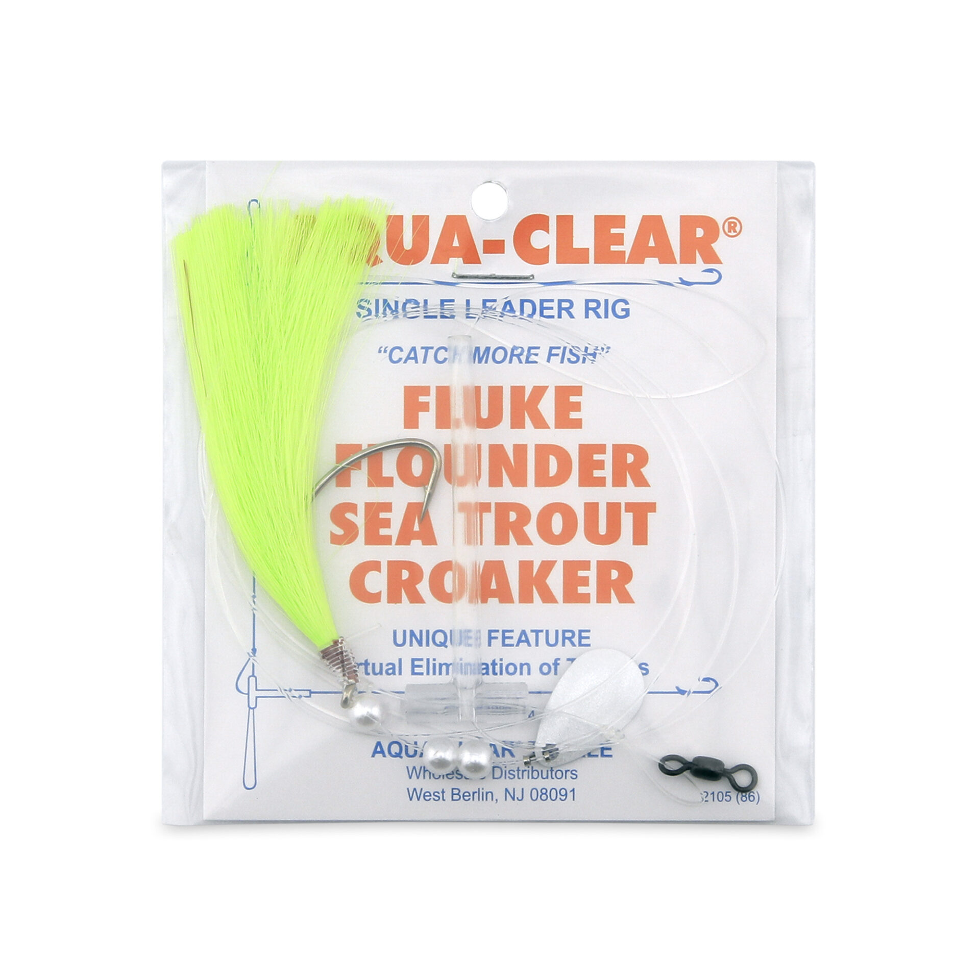 Aqua-Clear, XL Spinner Rig, Flounder/Fluke/Sea Trout/Croaker, 2/0 Nickel Wide Gap Hook, AFW Swivel, 40 lb / 18.1 kg GS Mono, Single Extra Large Chartreuse Hair Spinner, Pearls