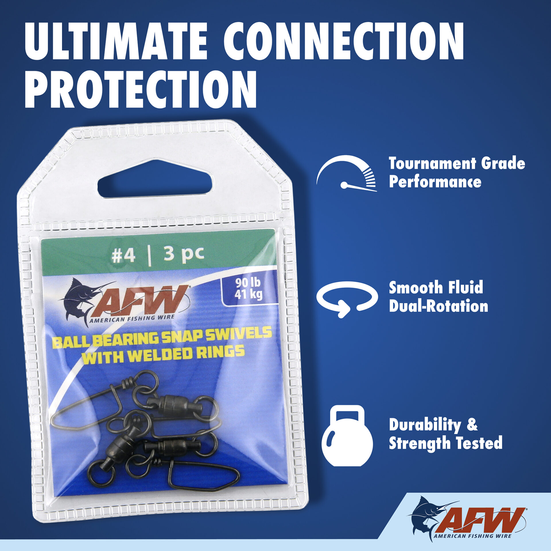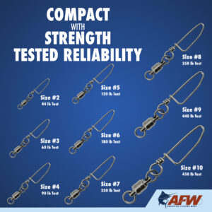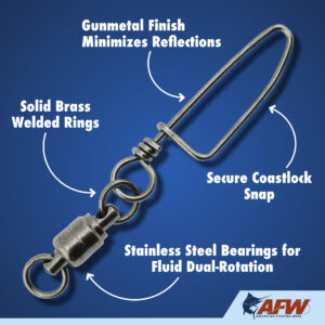 These dual-rotation solid brass Ball Bearing Snap Swivels are engineered to survive the fiercest one-on-one battles. The patented bullet shape provides fluid rotation and decreased water resistance. The unique gun metal black finish minimizes reflections and cloaks the tackle. Swivels have a solid brass body, stainless steel bearings, and welded rings for maximum security and to endure the unforgiving offshore environment. The tournament snaps are tempered and made of solid brass, designed to stay closed and keep you connected to the fish. Don’t even think about making a trip to the canyon, or out of sight of the shoreline, without these battle-tested ball bearing swivels in your tackle box. Patented US D552,137 S.