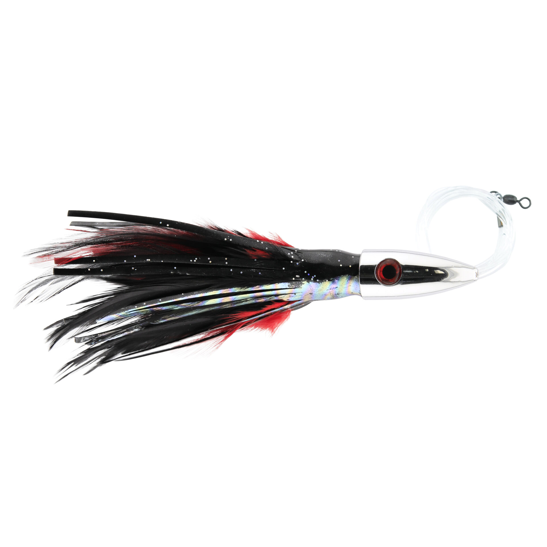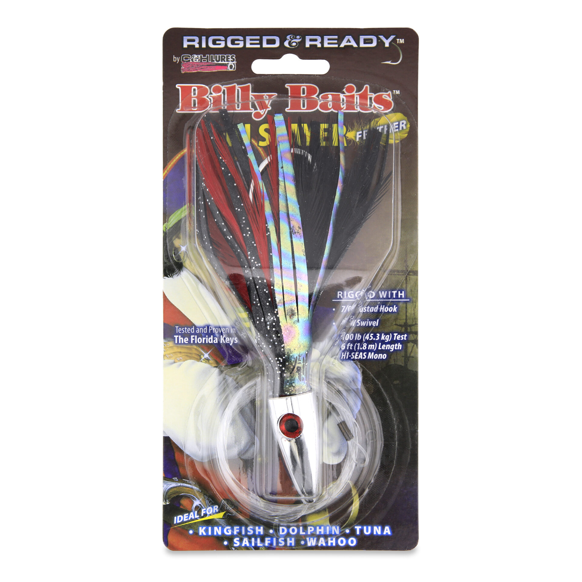 Billy Baits, Ahi Slayer Rigged & Ready, Black/Red Feather Skirt, 7/0 Mustad Hook, AFW Swivel, 100 lb / 45.3 kg Grand Slam Mono Line, 6 ft / 1.8 m