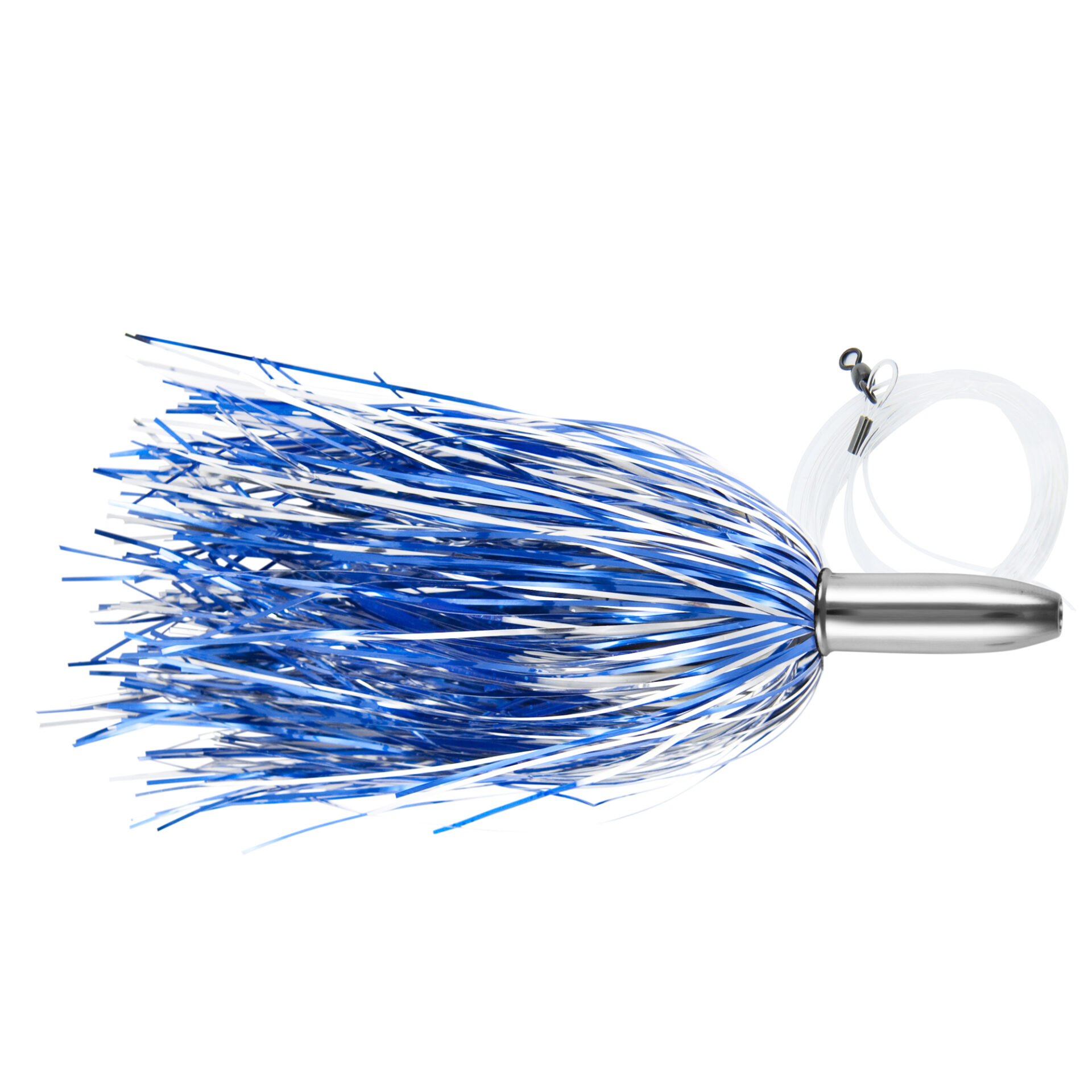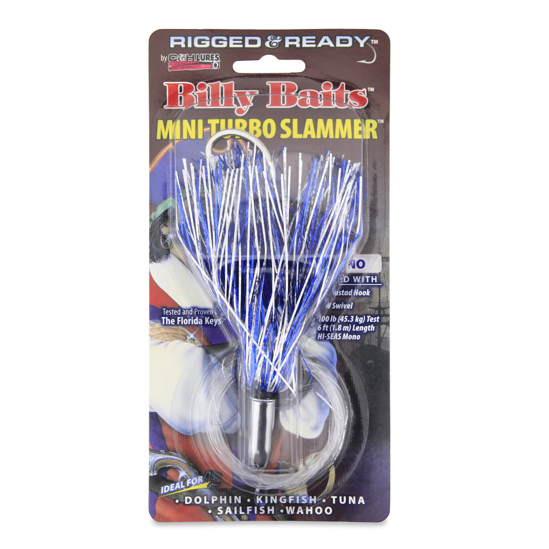 Billy Baits, Mini Turbo Slammer Rigged & Ready, Blue Silver/Blue Firetip, Concave Head, 7/0 Mustad Hook, AFW Swivel, 100 lb / 45.3 kg Grand Slam Mono Line, 6 ft / 1.8 m