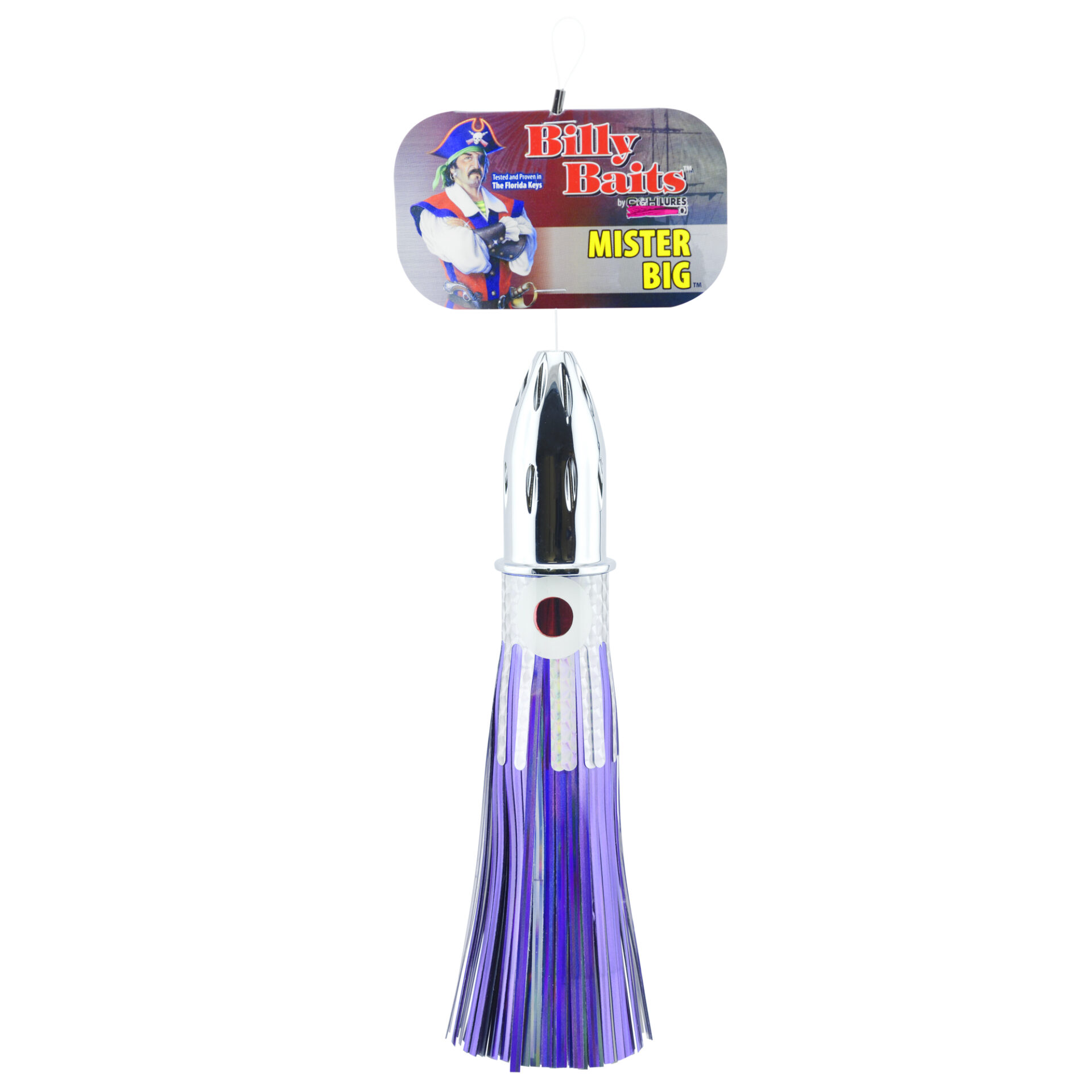 Billy Baits, Mister Big Lure, Black/Purple Mylar Skirt, 16 oz / 453 g Head, 9 in / 22.8 cm