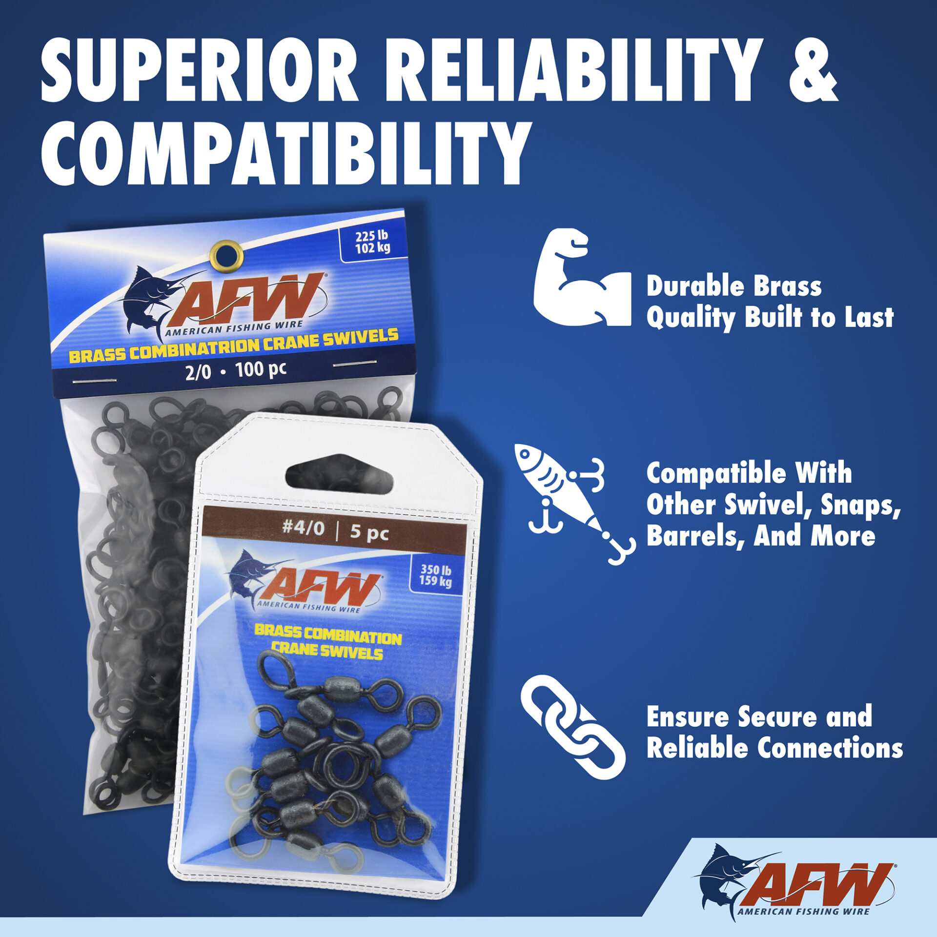Brass Combination Swivels are used in a similar manner as three-way swivels but provide an extra smooth rotation to prevent line twisting and kinking. Eyes are precisely formed to prevent pull-out under severe tension. Great for deep drop rigs!