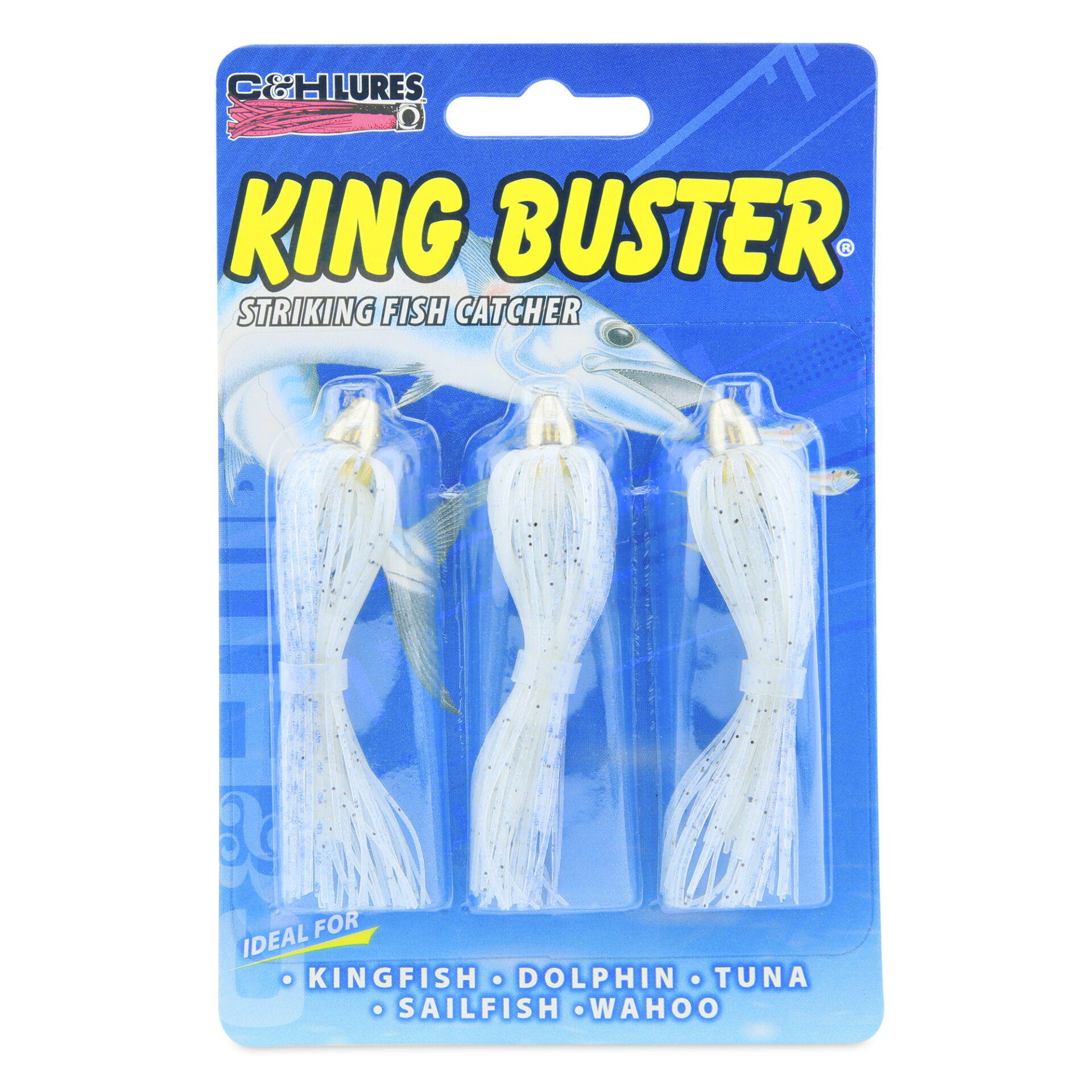 C&H, King Buster Lure, Blue Fleck/Glow Skirt, 1/8 oz / 3.5 g Head, 2.5 in / 6.35 cm, 3 pc