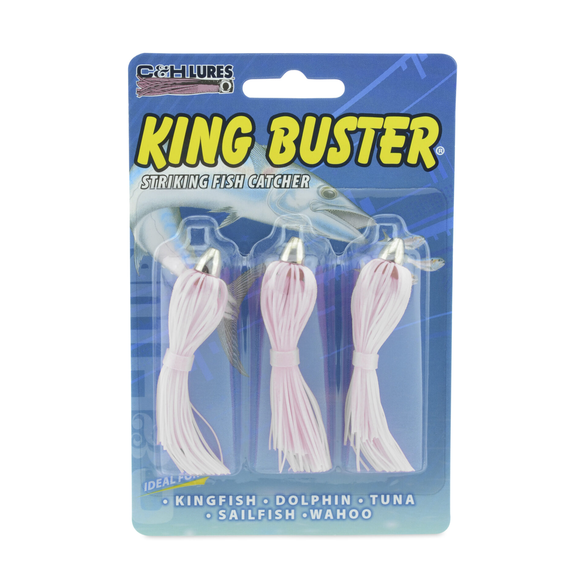 C&H, King Buster Lure, Iridescent Pearl/PearlMylar Skirt, 1/8 oz / 3.5 g Head, 2.5 in / 6.35 cm, 3 pc