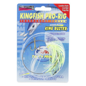 C&H, King Buster Pro-Rig, 1/8 oz / 3.5 g Head, Blue/Chartreuse/Silver Skirt, Two #4 4x Treble Hooks, AFW Swivel, AFW Tooth Proof Camo Brown Wire, 3 ft / 0.91 m
