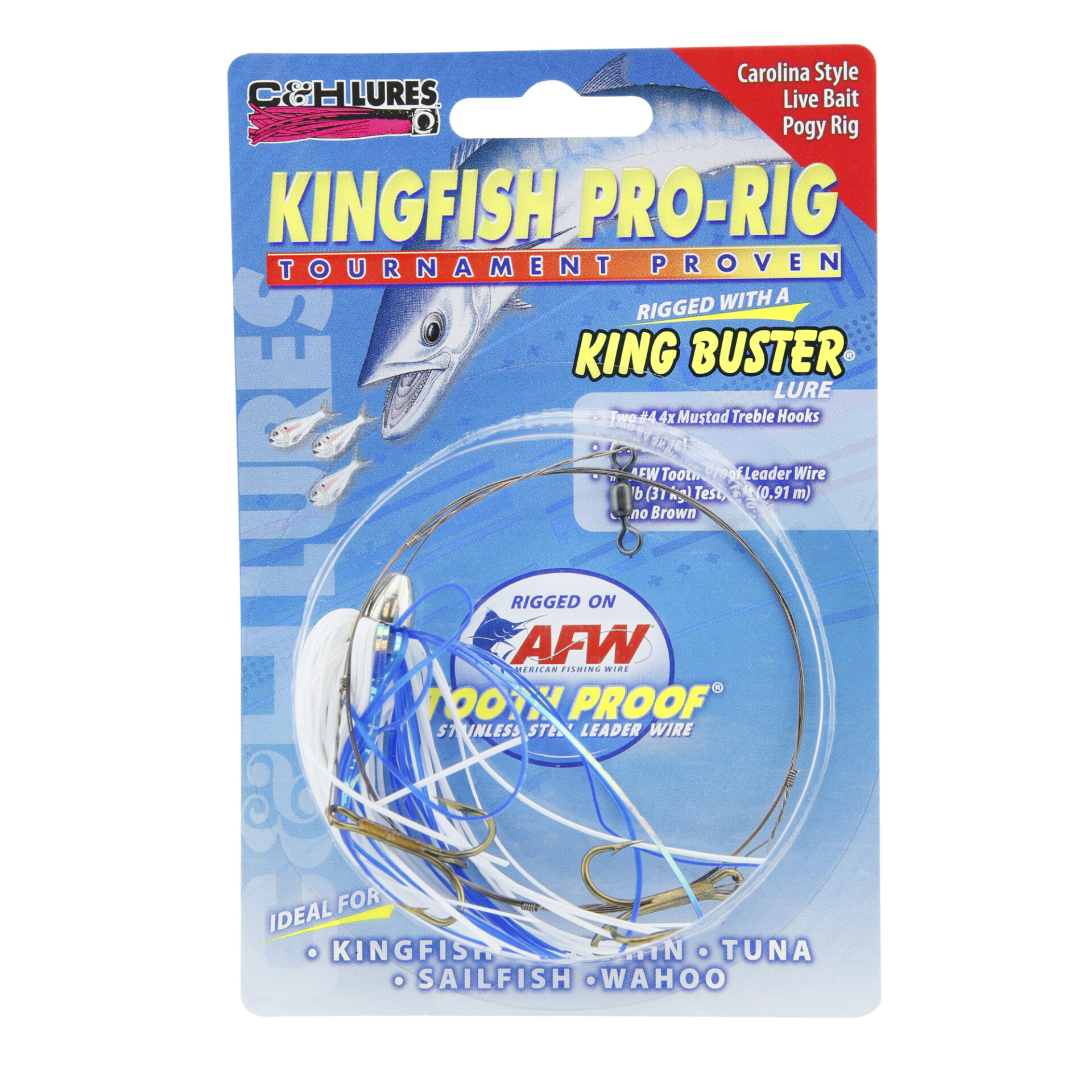 C&H, King Buster Pro-Rig, 1/8 oz / 3.5 g Head, White/Blue Mylar Skirt, Two #4 4x Treble Hooks, AFW Swivel, AFW Tooth Proof Camo Brown Wire, 3 ft / 0.91 m