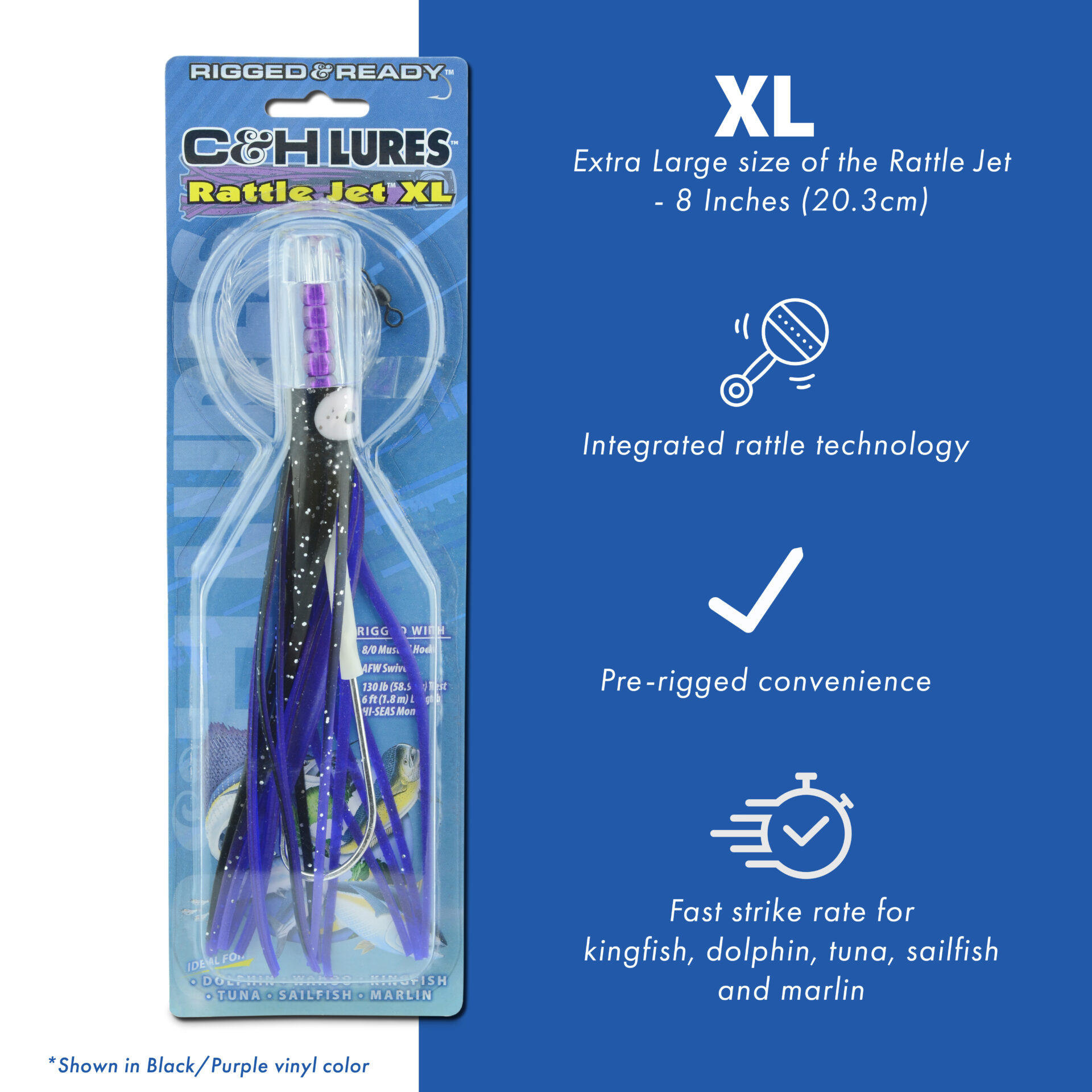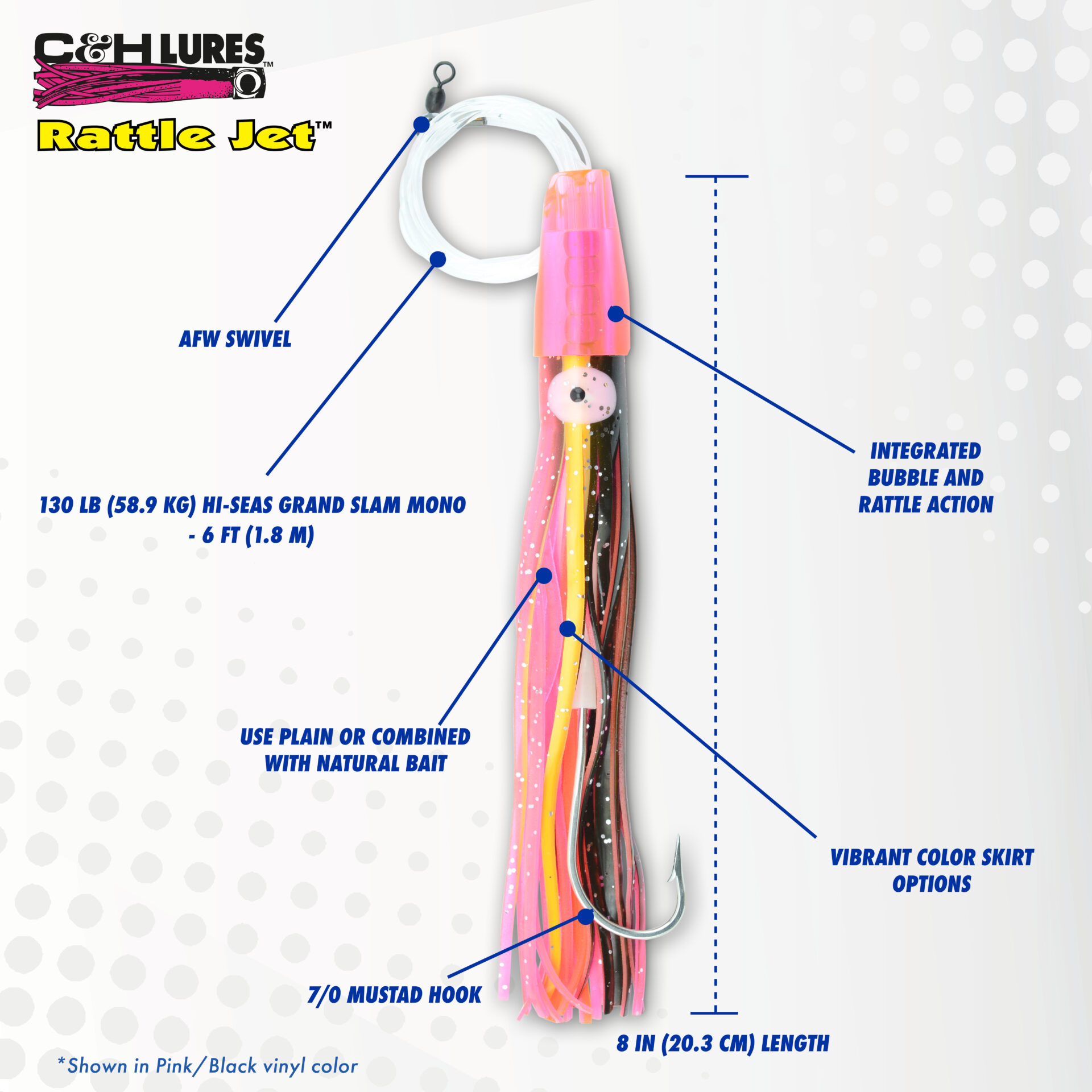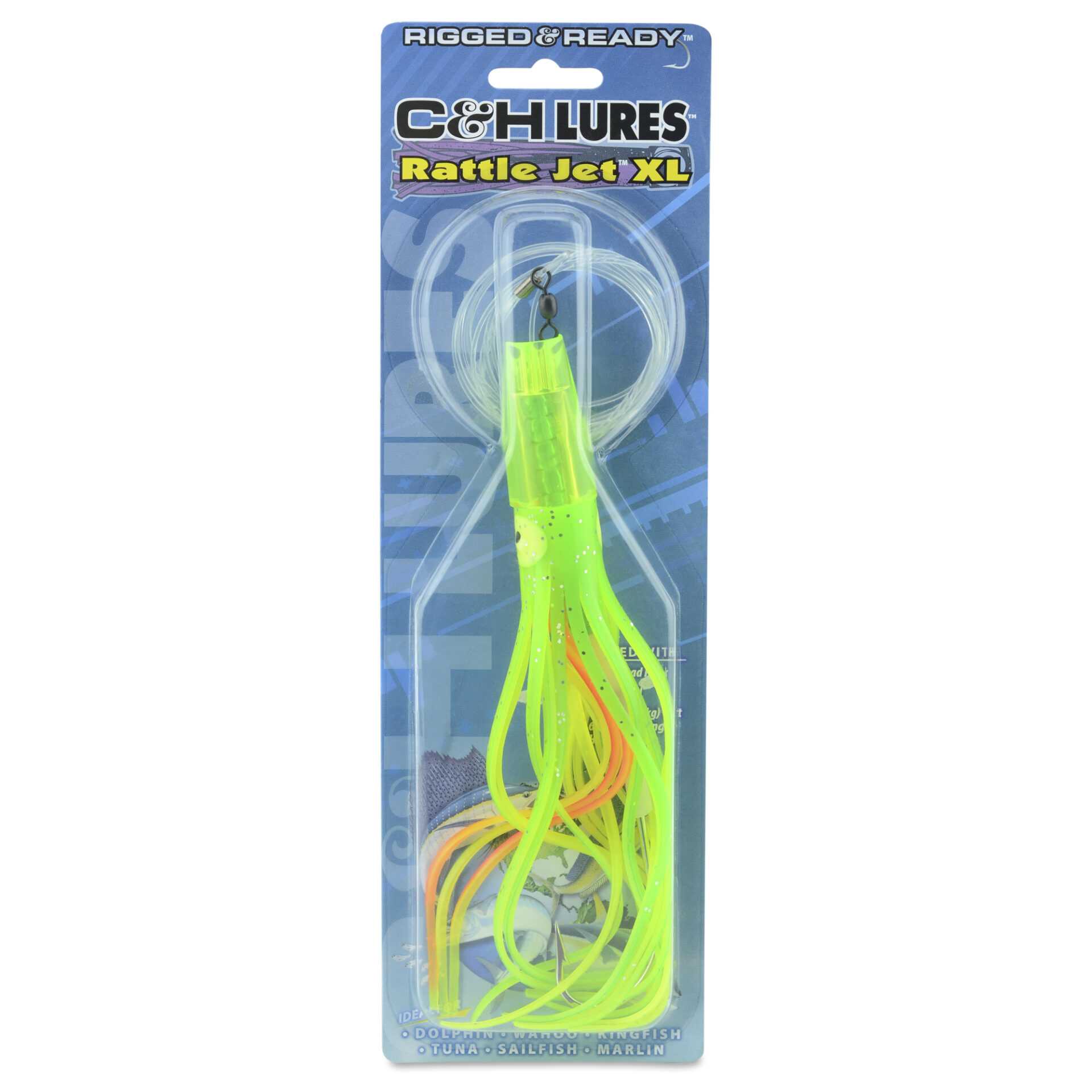 C&H, Rattle Jet XL Rigged & Ready, Green/Yellow Skirt, 8/0 Mustad Hook, AFW Swivel, 130 lb / 58.9 kg Grand Slam Mono Line, 6 ft / 1.8 m