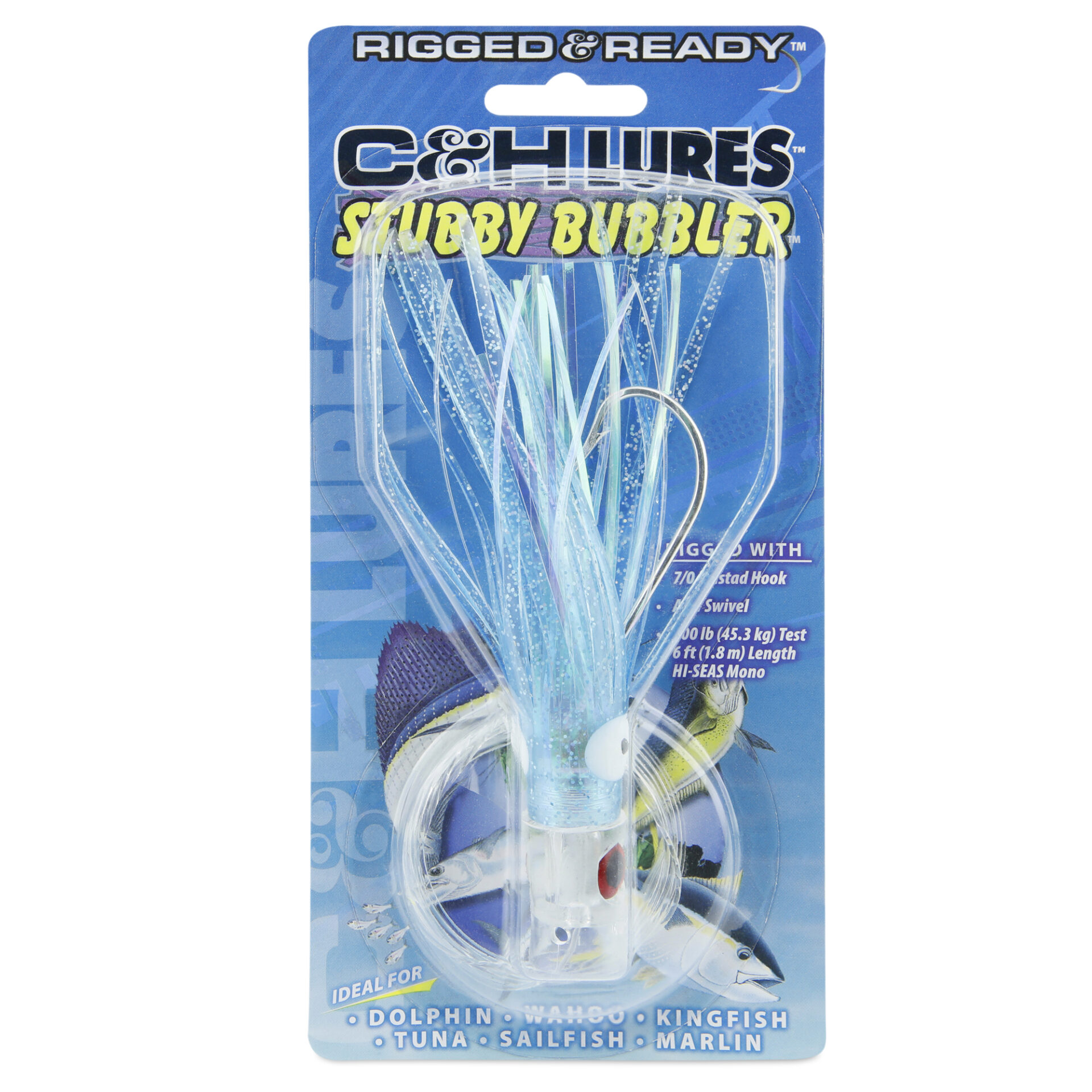 C&H, Stubby Bubbler Rigged & Ready, Lt. Blue/Pearl Skirt, 7/0 Mustad Hook, AFW Swivel, 100 lb / 45.3 kg Grand Slam Mono Line, 6 ft / 1.8 m