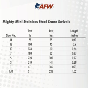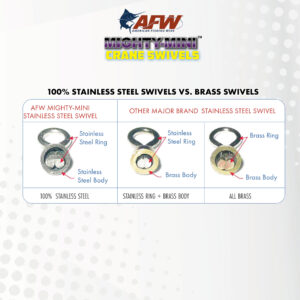 Mighty-Mini Crane Swivels are 100% stainless steel and are 3 times stronger than conventional components of the same size. Smart anglers know that terminal tackle can spook wary game fish. The Might Mini line of compact, 100% stainless steel swivels was engineered to be smaller and stronger than the leading brands of swivels on the market. Now you can use swivels for your rigs, and snap swivels for attaching lures, that are less visible and significantly more powerful.