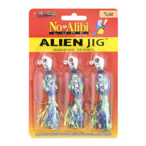 No Alibi, Alien Jig Inshore Series, Pearl Blue Skirt, 3/8 oz / 10.6 g White Head, 5/0 Hook, 3 pc