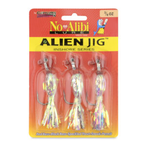 No Alibi, Alien Jig Inshore Series, Pearl Skirt, 3/8 oz / 10.6 g Red Head, 5/0 Hook, 3 pcNo Alibi, Alien Jig Inshore Series, Pearl Skirt, 3/8 oz / 10.6 g Red Head, 5/0 Hook, 3 pc