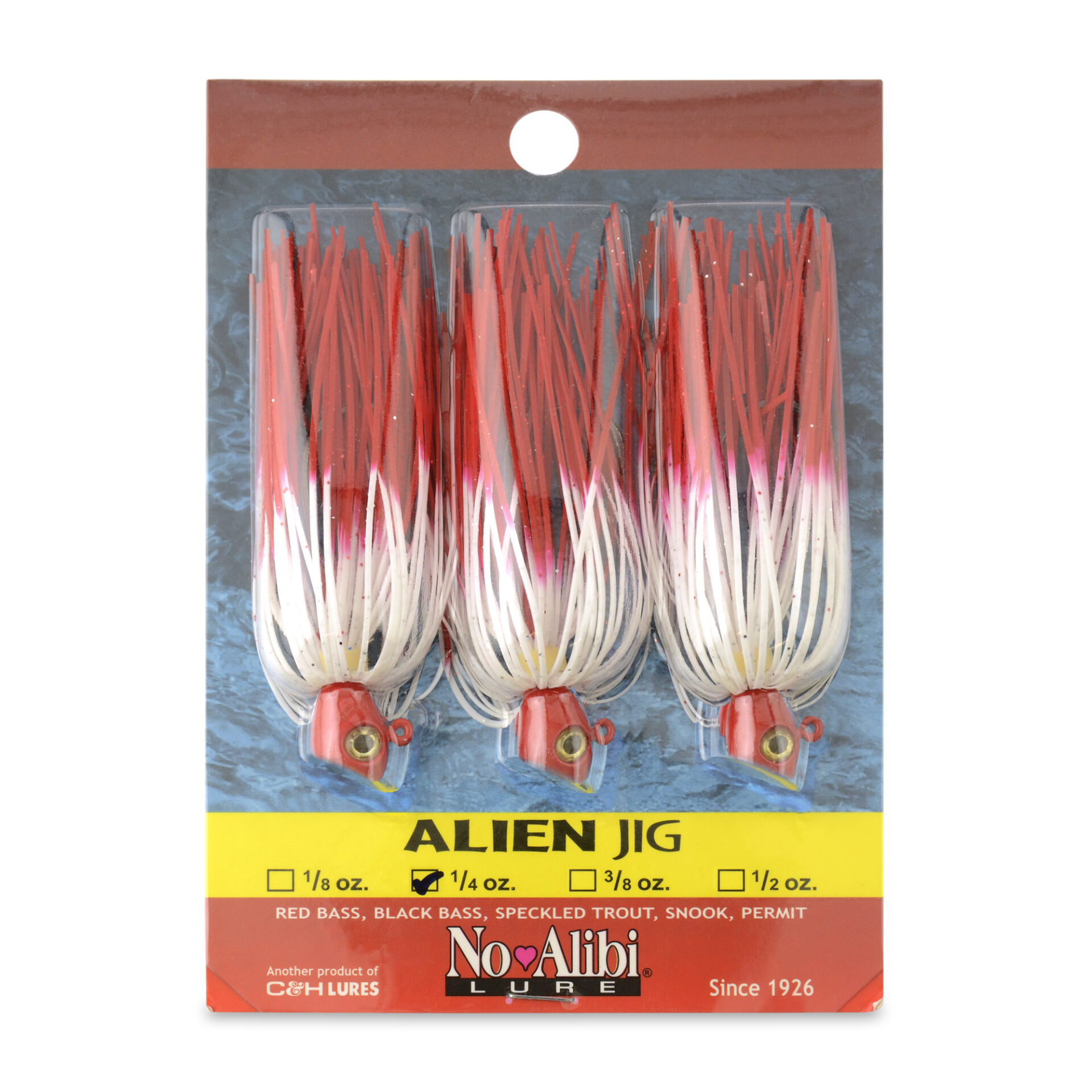 No Alibi, Alien Jig Inshore Series, Red/White Skirt, 1/4 oz / 7.0 g Red Head, 4/0 Hook, 3 pc