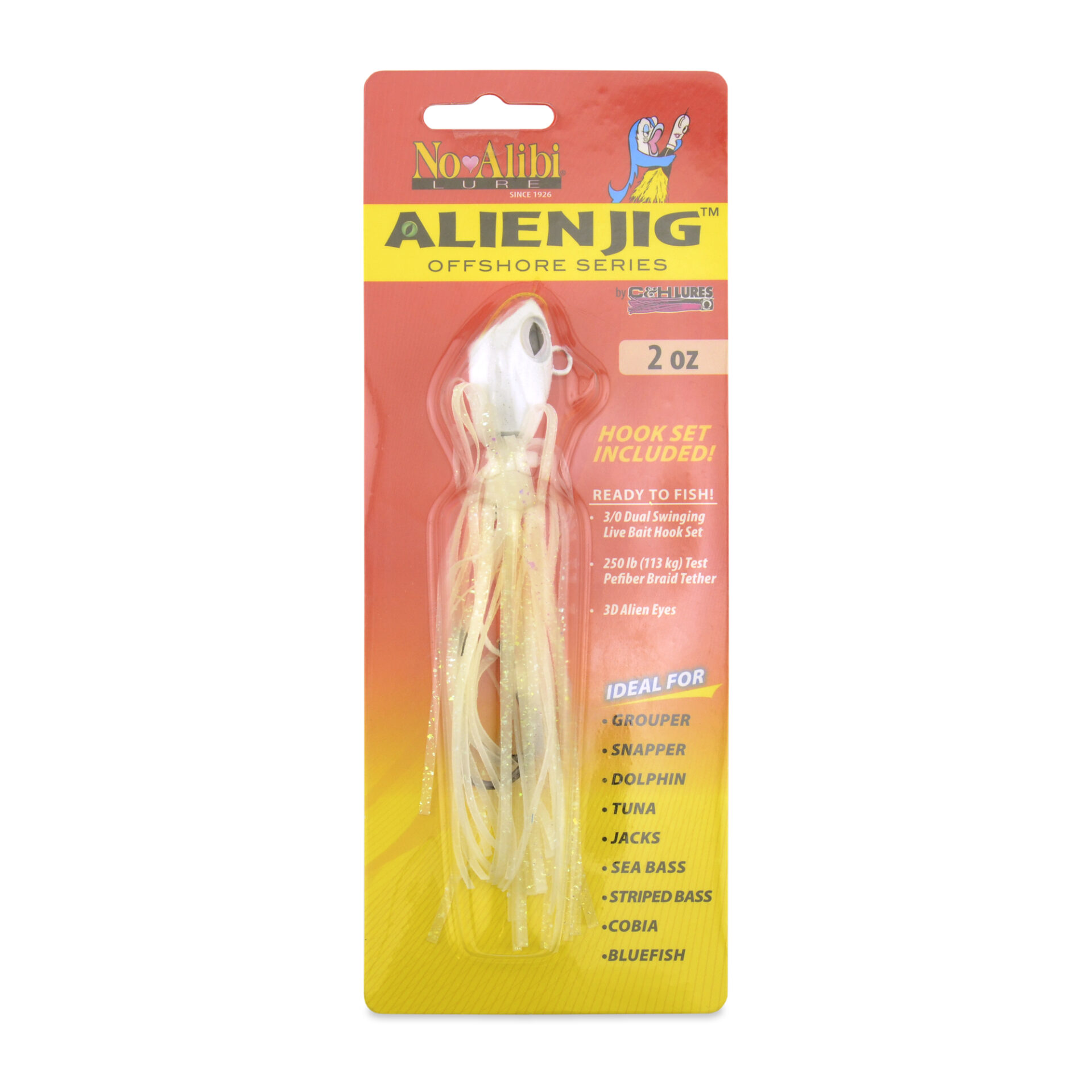 No Alibi, Alien Jig Offshore Series, Fluorescent White Skirt, 2 oz / 56.6 g White Head, 5/0 Hooks (2)