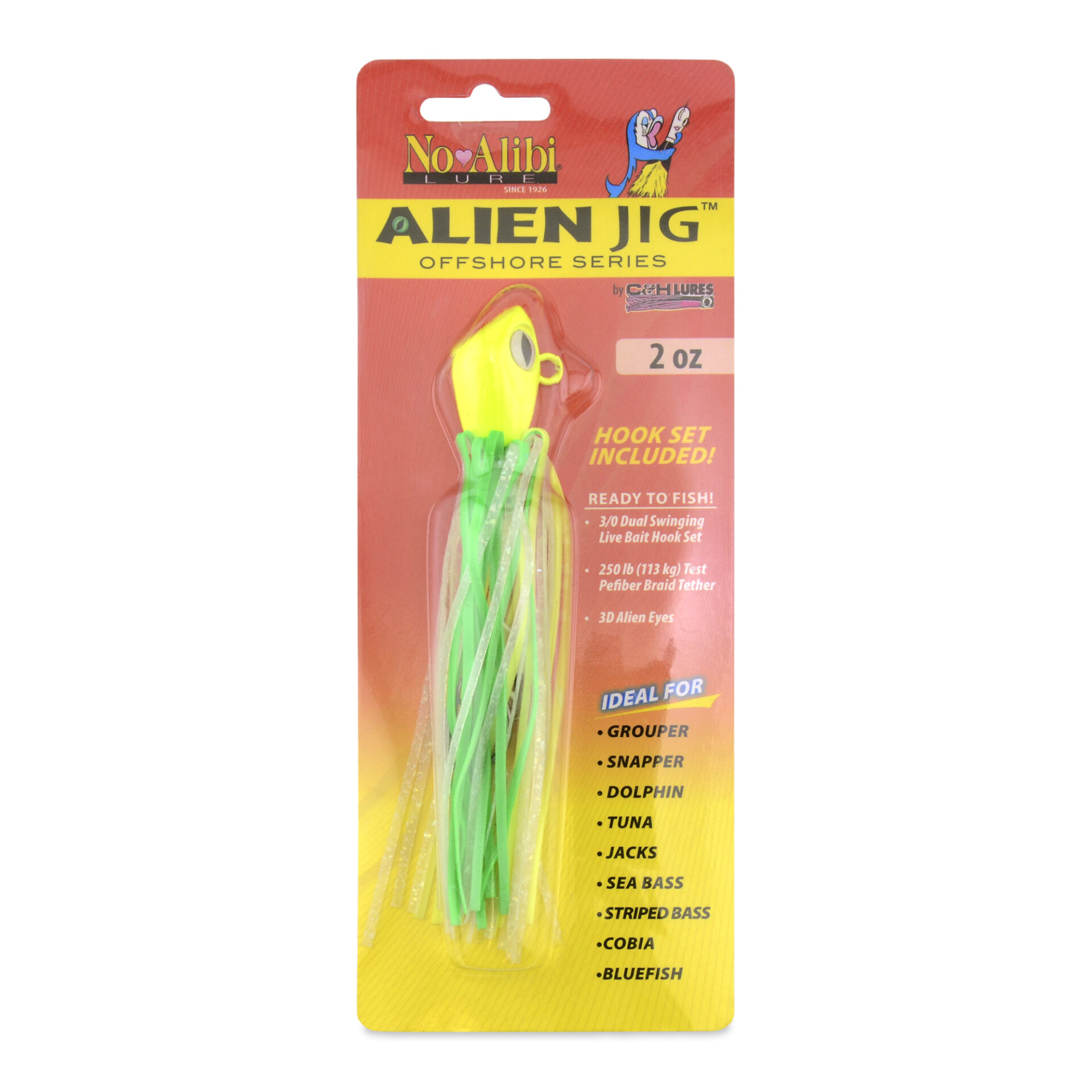 No Alibi, Alien Jig Offshore Series, Glow Green/Chartreuse Skirt, 2 oz / 56.6 g Green Head, 5/0 Hooks (2)