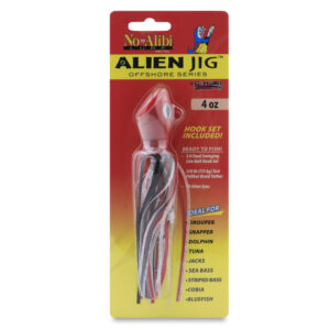 No Alibi, Alien Jig Offshore Series, Glow Red/Black Skirt, 4 oz / 113 g Red Head, 5/0  Hooks (2)No Alibi, Alien Jig Offshore Series, Glow Red/Black Skirt, 4 oz / 113 g Red Head, 5/0 Hooks (2)