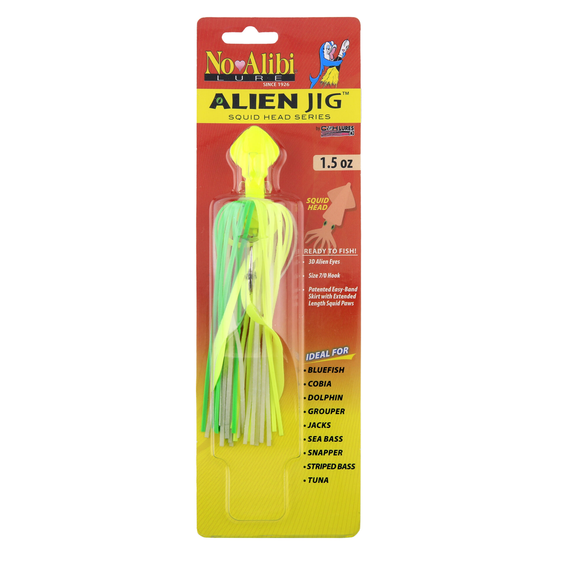 No Alibi, Alien Jig – Squid Head, 1.5 oz / 42.5 g, Glow Green/Chartreuse Head, Skirt, Chartreuse Squid Paws, 7/0 Hook