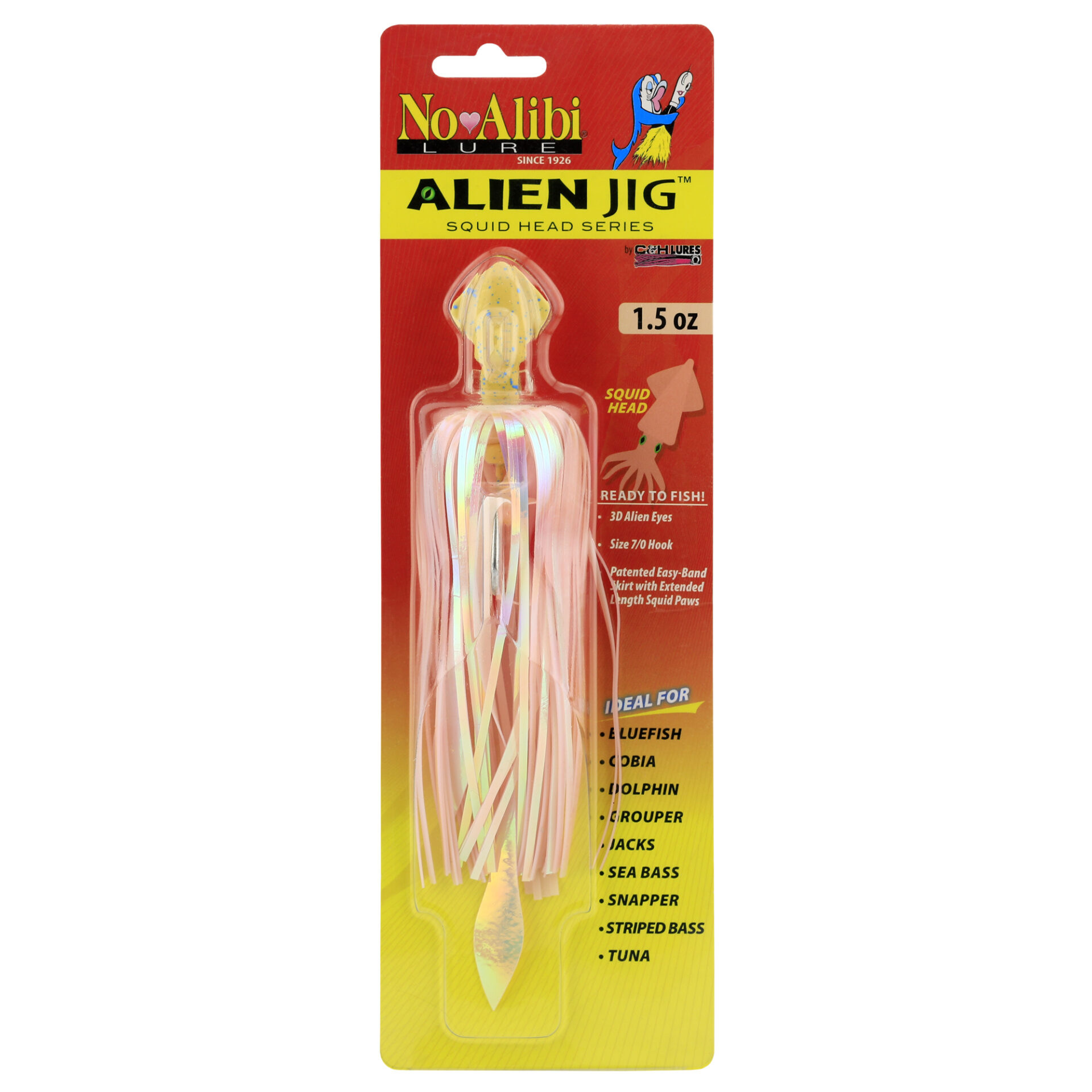 No Alibi, Alien Jig – Squid Head, 1.5 oz / 42.5 g, Natural/White Speckle Head, Natural Holo Squid Skirt, Natural Squid Paws, 7/0 Hook