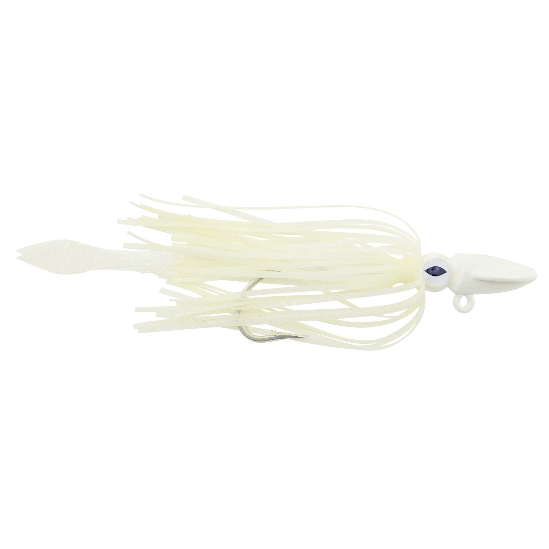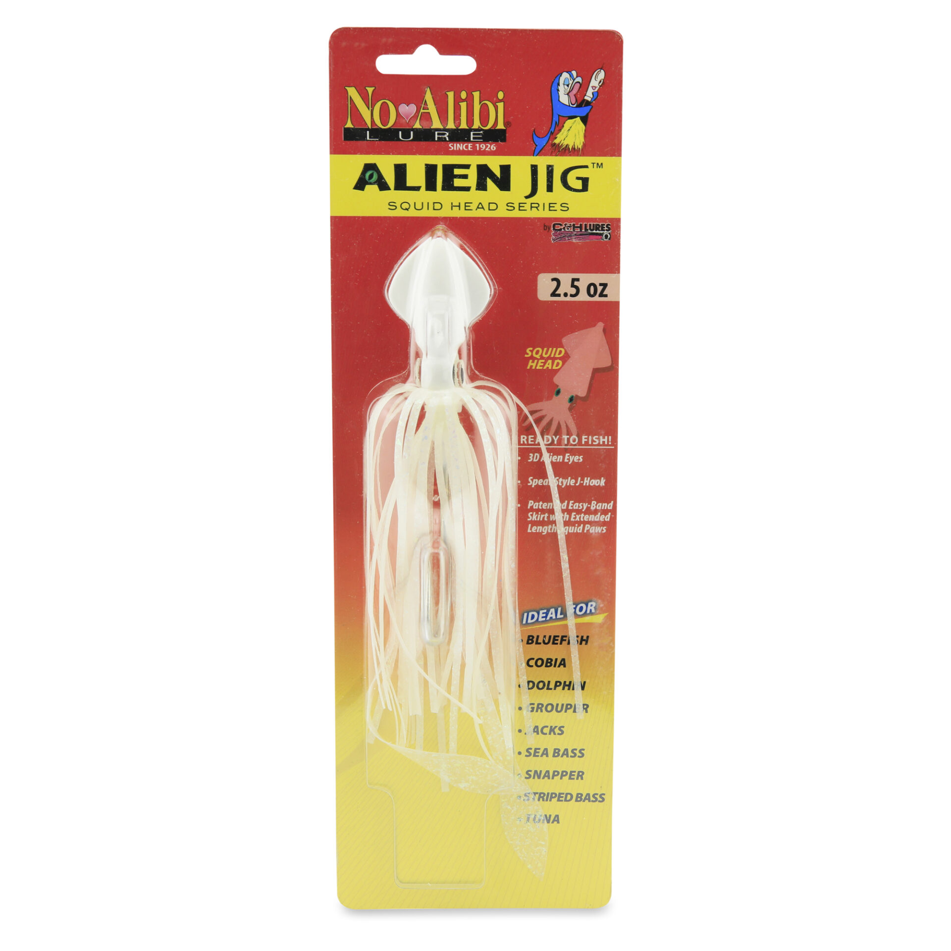 No Alibi, Alien Jig - Squid Head, 2.5 oz / 70.9 g, Glow Pearl White Head, Fluorescent White Skirt and Squid Paws, 9/0 Hook, 8.5 in / 21.6 cmNo Alibi, Alien Jig – Squid Head, 2.5 oz / 70.9 g, Glow Pearl White Head, Fluorescent White Skirt and Squid Paws, 9/0 Hook, 8.5 in / 21.6 cm