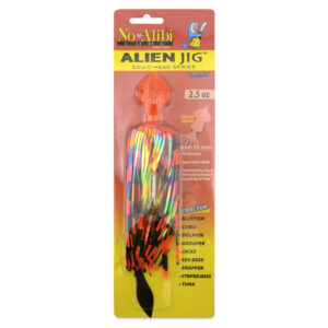 No Alibi, Alien Jig – Squid Head, 2.5 oz / 70.9 g, Orange/Black Speckle Head, Orange/Black Holo Skirt, Black Squid Paws, 9/0 Hook, 8.5 in / 21.6 cm