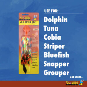 No Alibi, Alien Jig – Squid Head, 2.5 oz / 70.9 g, Pink/Blue Speckle Head, Pink/Clear/Blue Disco Skirt, Pink Squid Paws, 9/0 Hook, 8.5 in / 21.6 cm