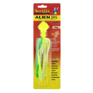 No Alibi, Alien Jig – Squid Head, 4 oz / 113.4 g, Glow Green/Chartreuse Head, Green/Chartreuse Skirt, Chartreuse Squid Paws, 10/0 Hook