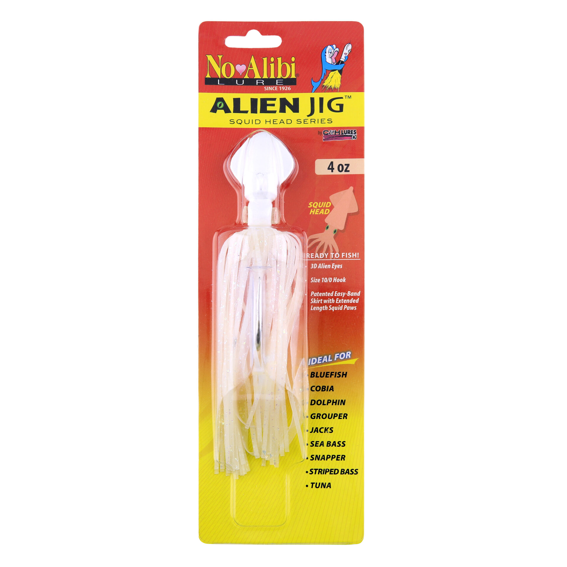 No Alibi, Alien Jig – Squid Head, 4 oz / 113.4 g, Glow Pearl White Head, Fluorescent White Skirt and Squid Paws, 10/0 Hook