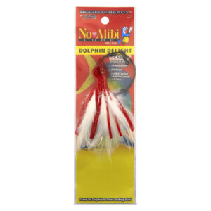 No Alibi, Dolphin Delight Rigged & Ready, Red/White Skirt, 1/2 oz / 14.1 g Lead Head, 4.5 in / 11.4 cm, 7/0 Mustad Hook, AFW Swivel, 135 lb / 61 kg AFW Cable, 3 ft / 0.9 m