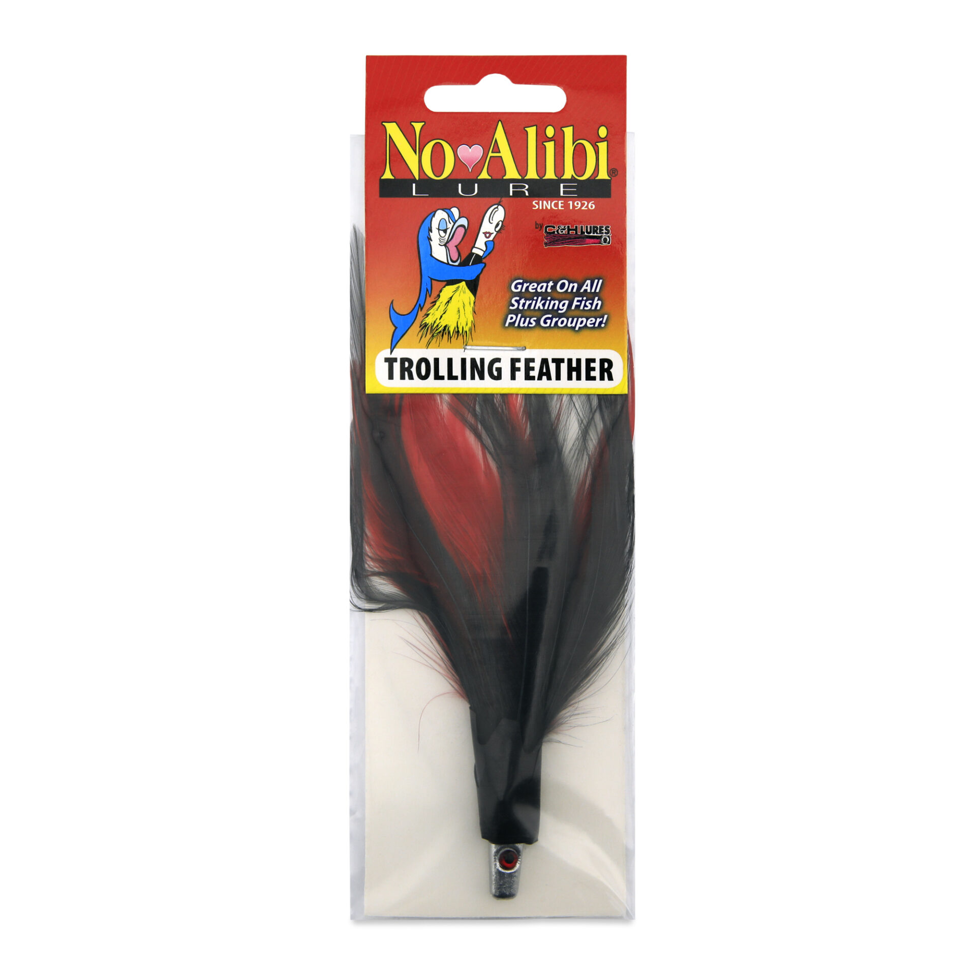 No Alibi, Trolling Feather Lure, Black/Red Skirt, 1/4 oz / 7.08 g Head