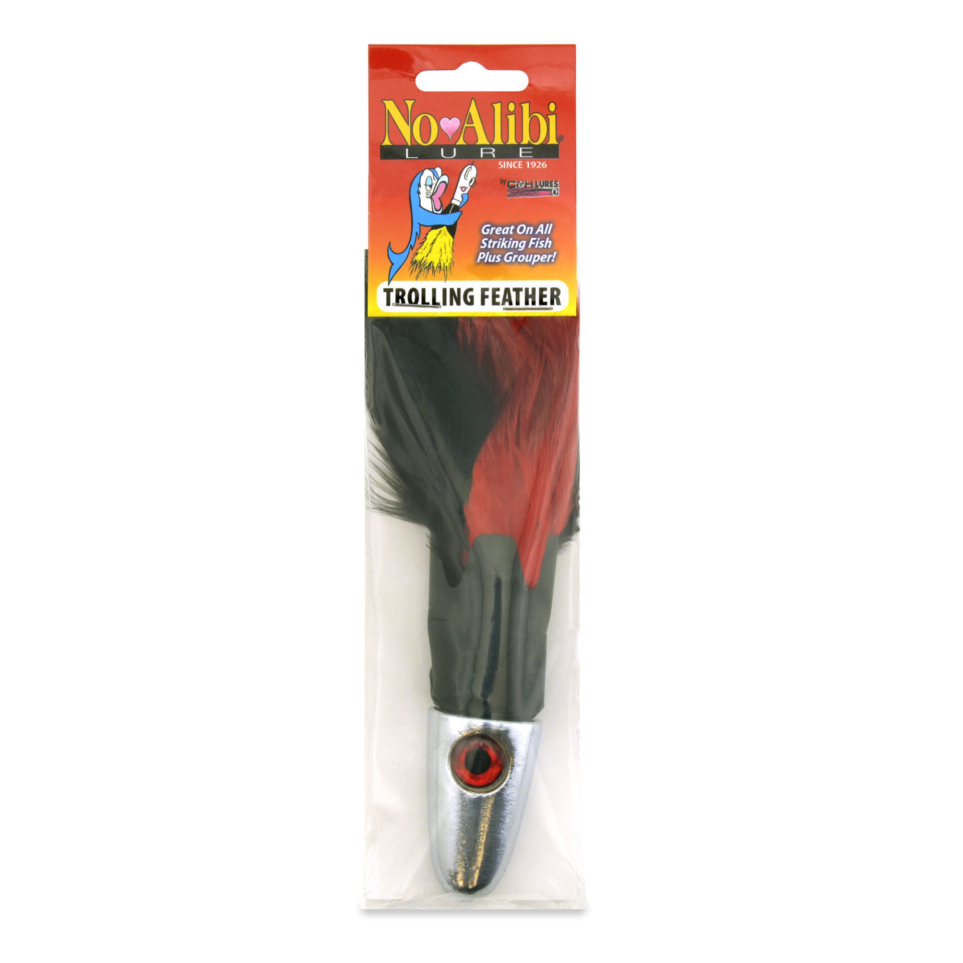 No Alibi, Trolling Feather Lure, Black/Red Skirt, 8 oz / 226 g Head