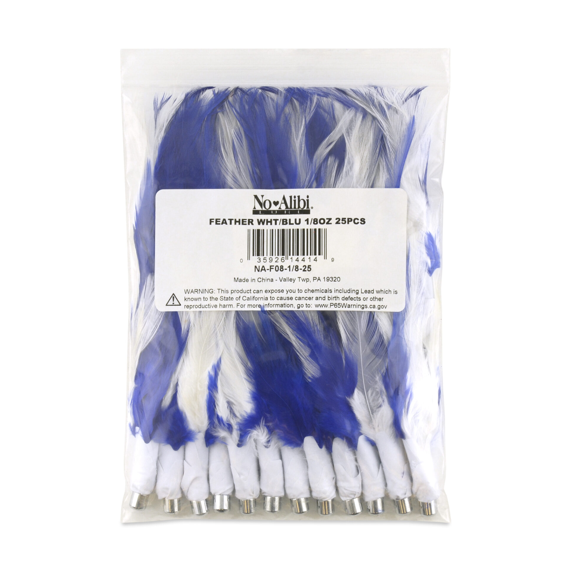 No Alibi, Trolling Feather Lure, White/Blue Skirt, 1/8 oz / 3.54 g Head, 25 pc