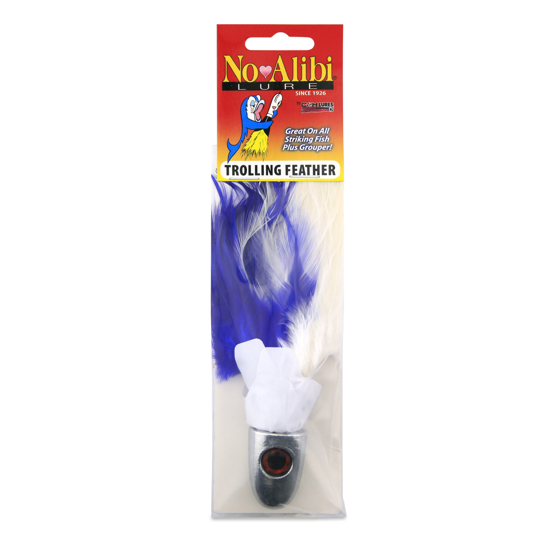 No Alibi, Trolling Feather Lure, White/Blue Skirt, 4 oz / 113 g Head
