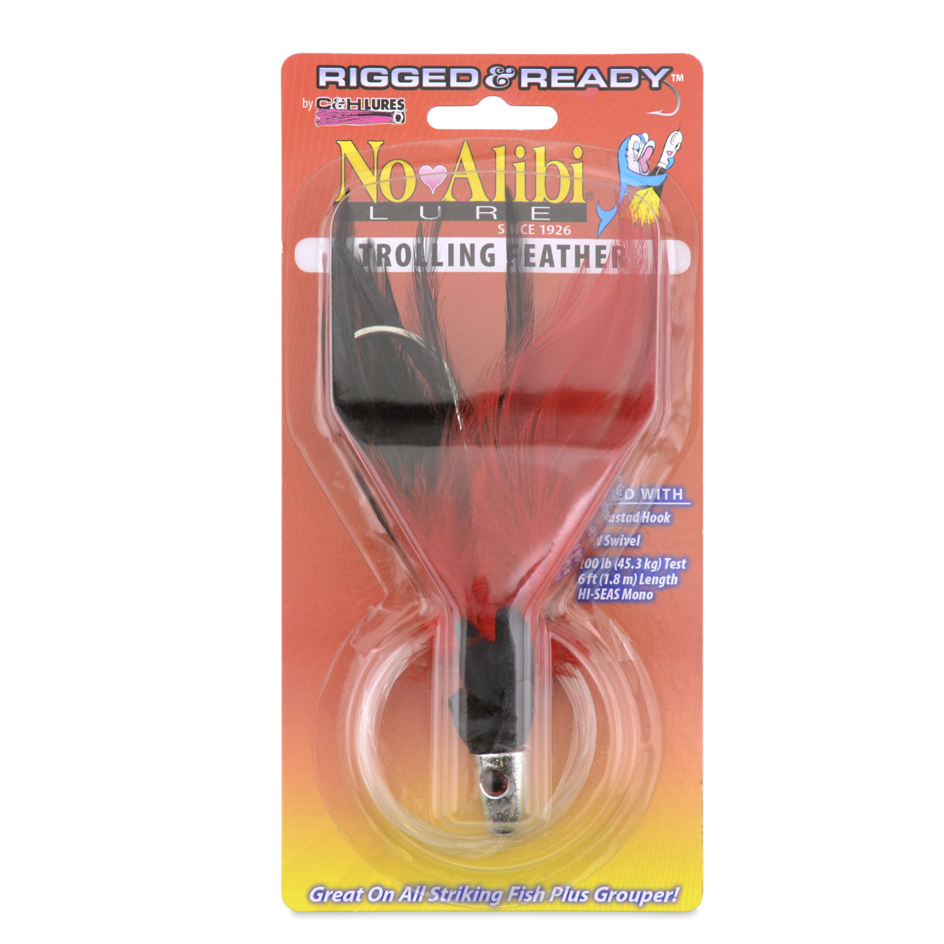 No Alibi,Trolling Feather Rigged & Ready, Black/Red Skirt, 1 oz / 28.3 g, 7/0 Mustad Hook, AFW Swivel, 100 lb / 45.3 kg Grand Slam Mono Line, 6 ft / 1.8 m